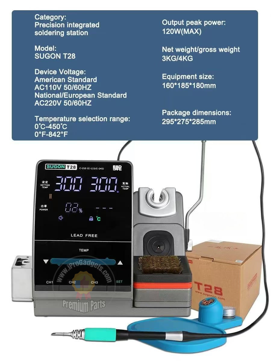 The SUGON T28 Soldering Iron is a high-end, precision soldering tool designed for advanced electronics work. It features state-of-the-art heating technology, precise temperature control, and a robust build, making it suitable for demanding soldering tasks in professional settings.